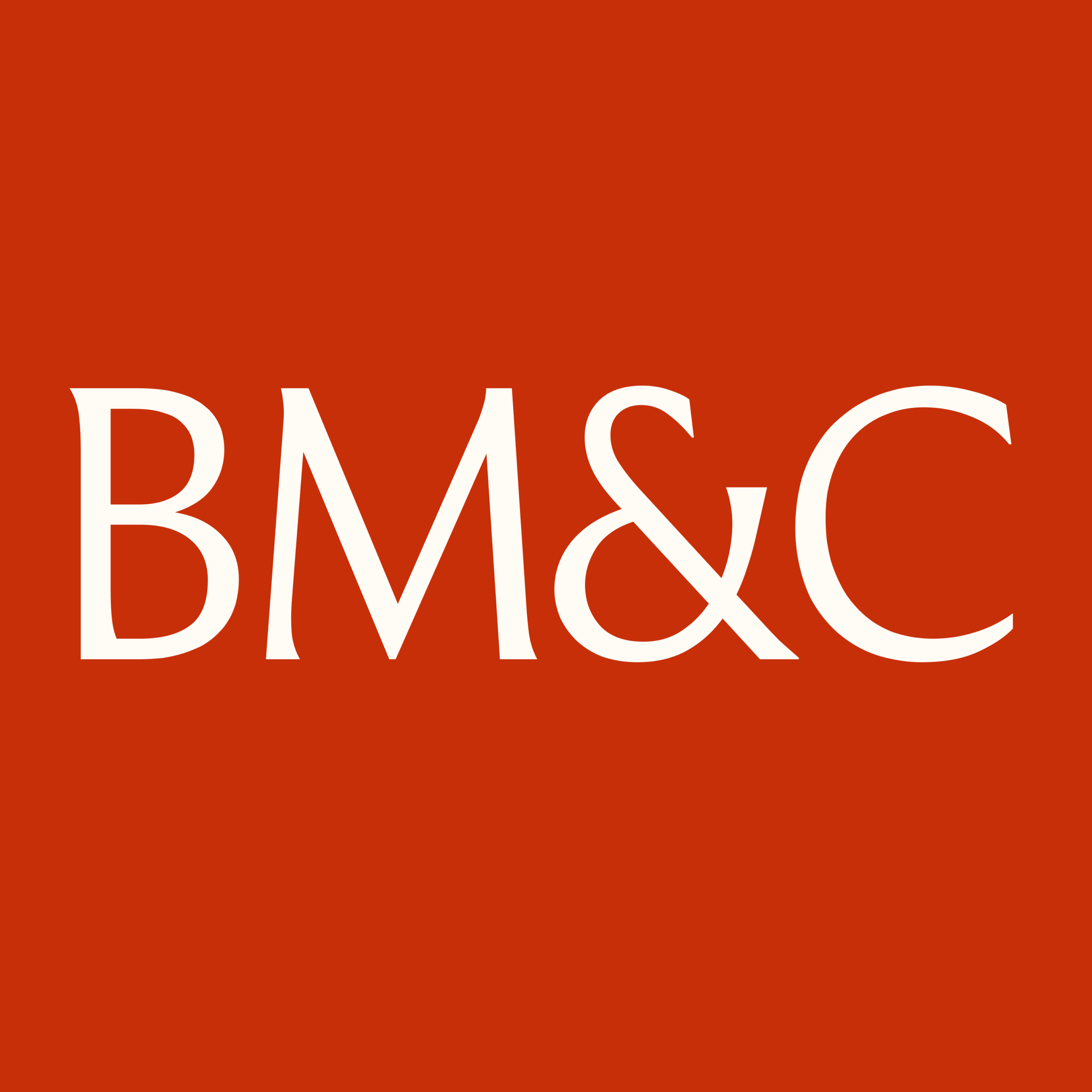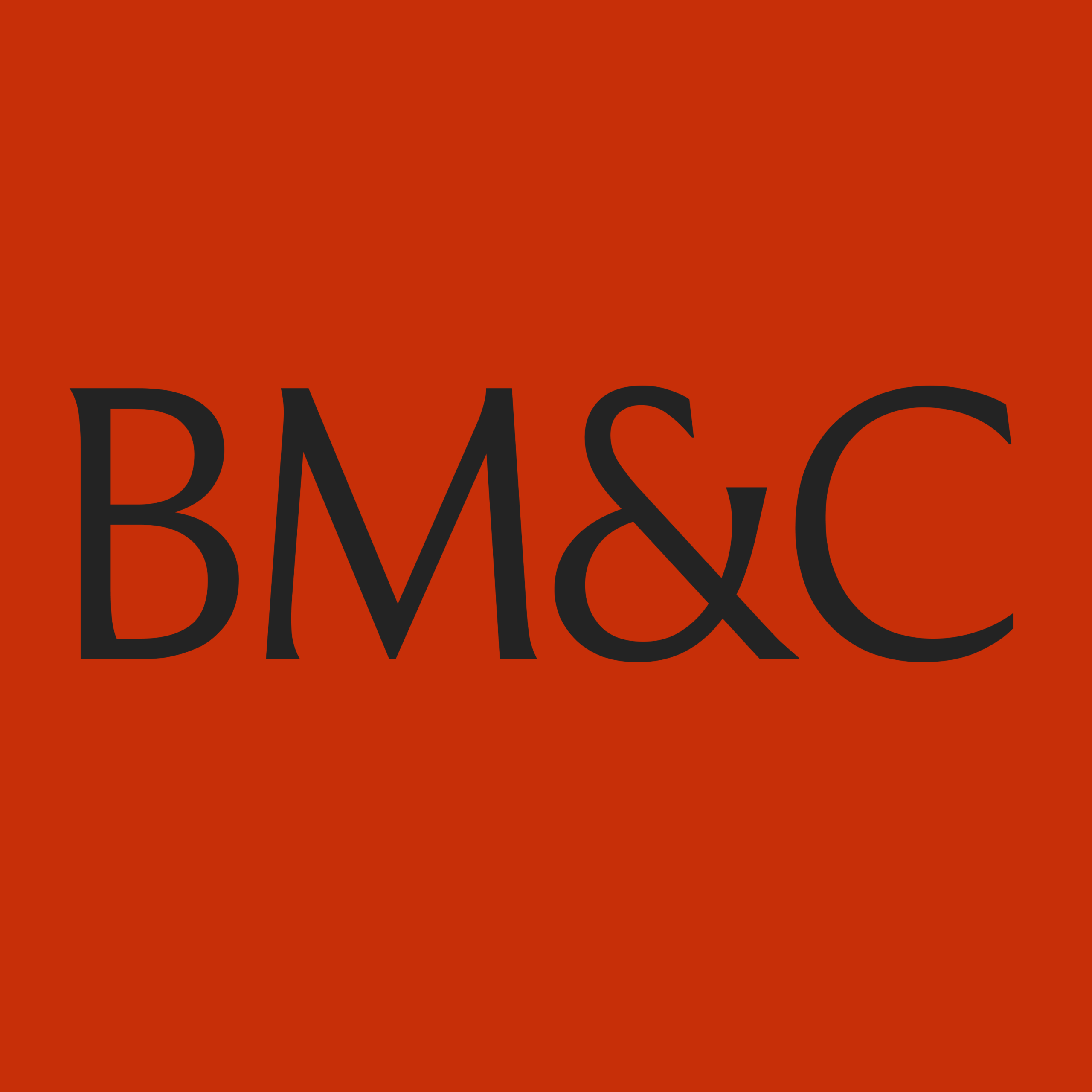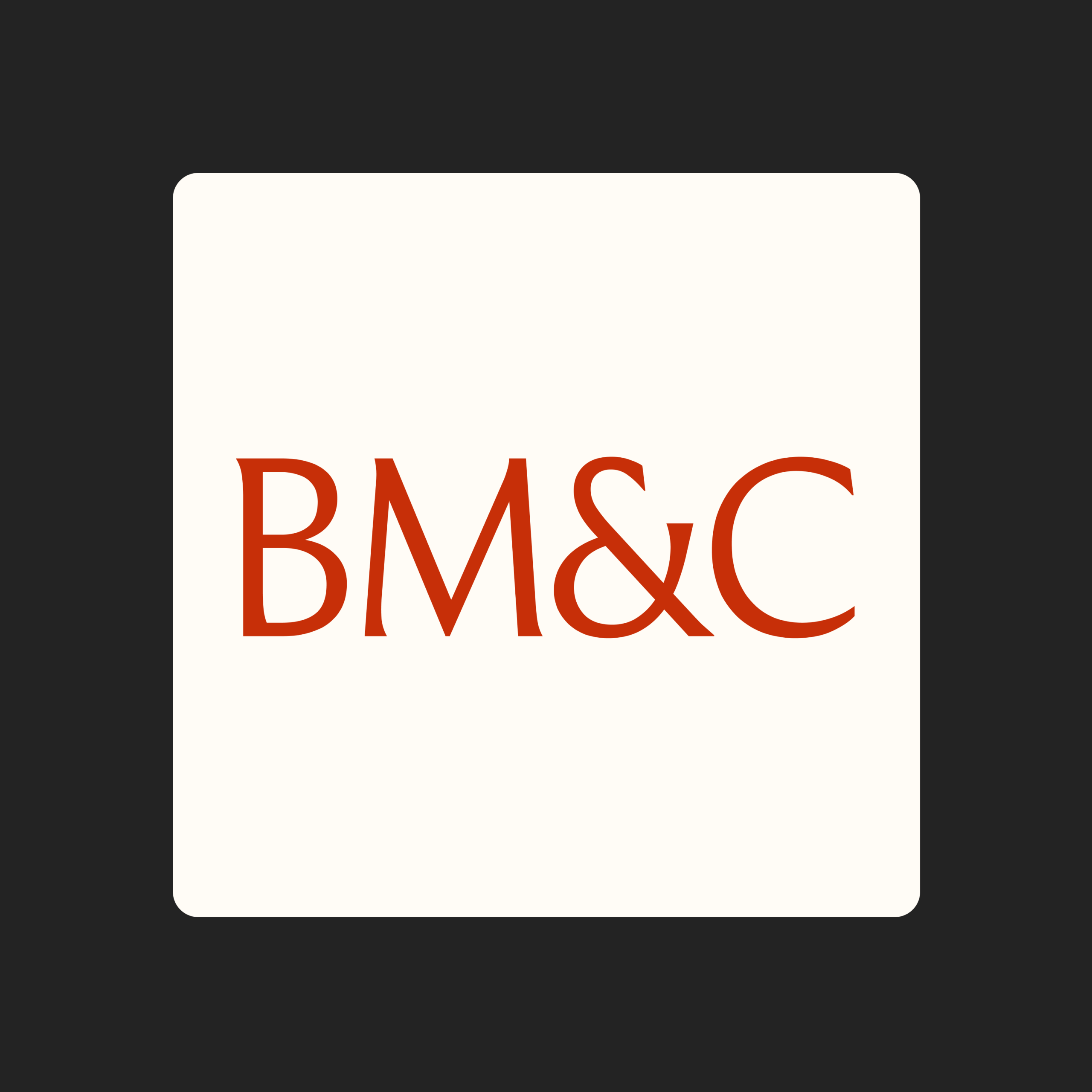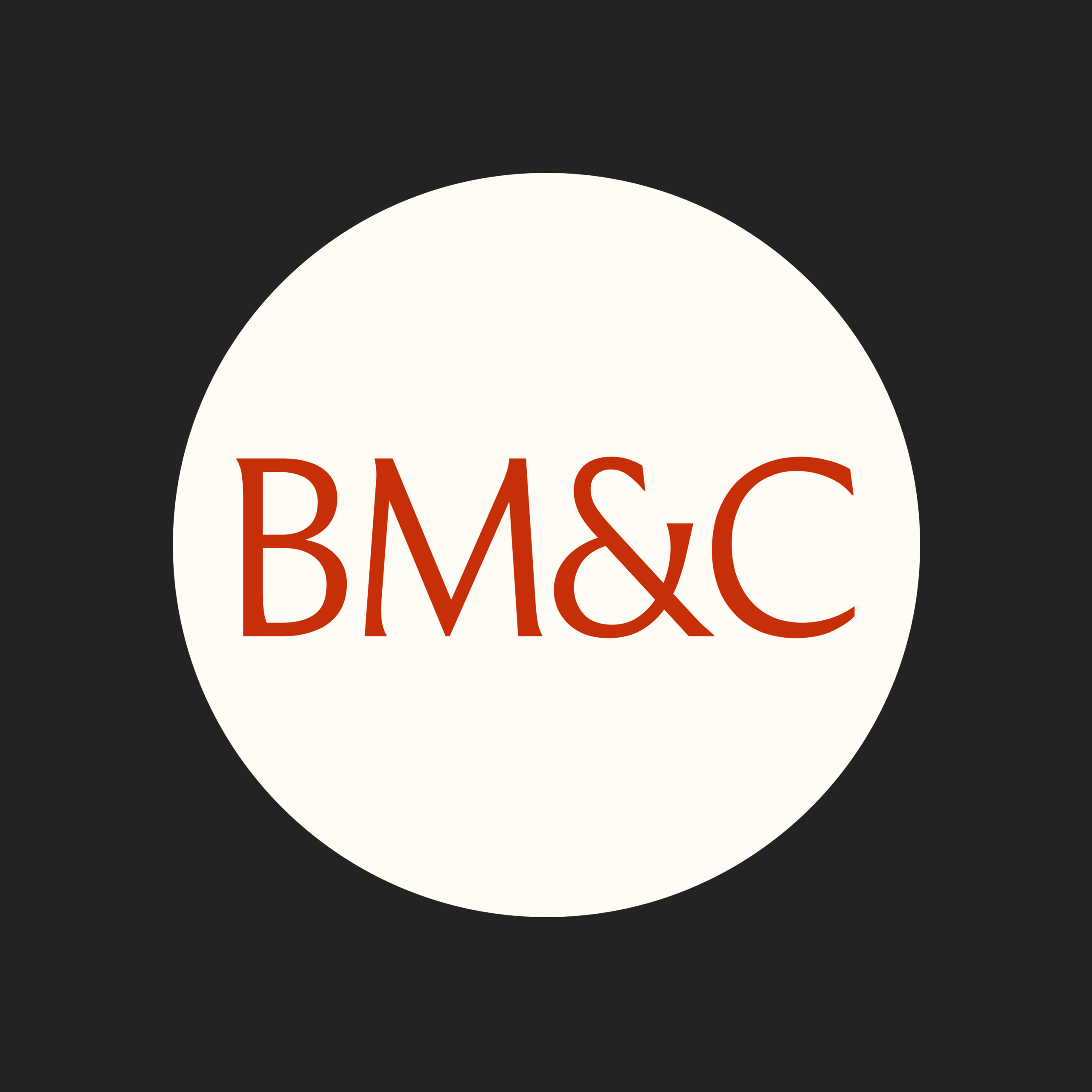 Le logo existe également en version courte. Les initiales BM&C permettent de créer un sigle élégant et impactant. Il peut être utilisé graphiquement pour habiller l'espace, ou au contraire pour assurer une lisibilité sur les petits formats.