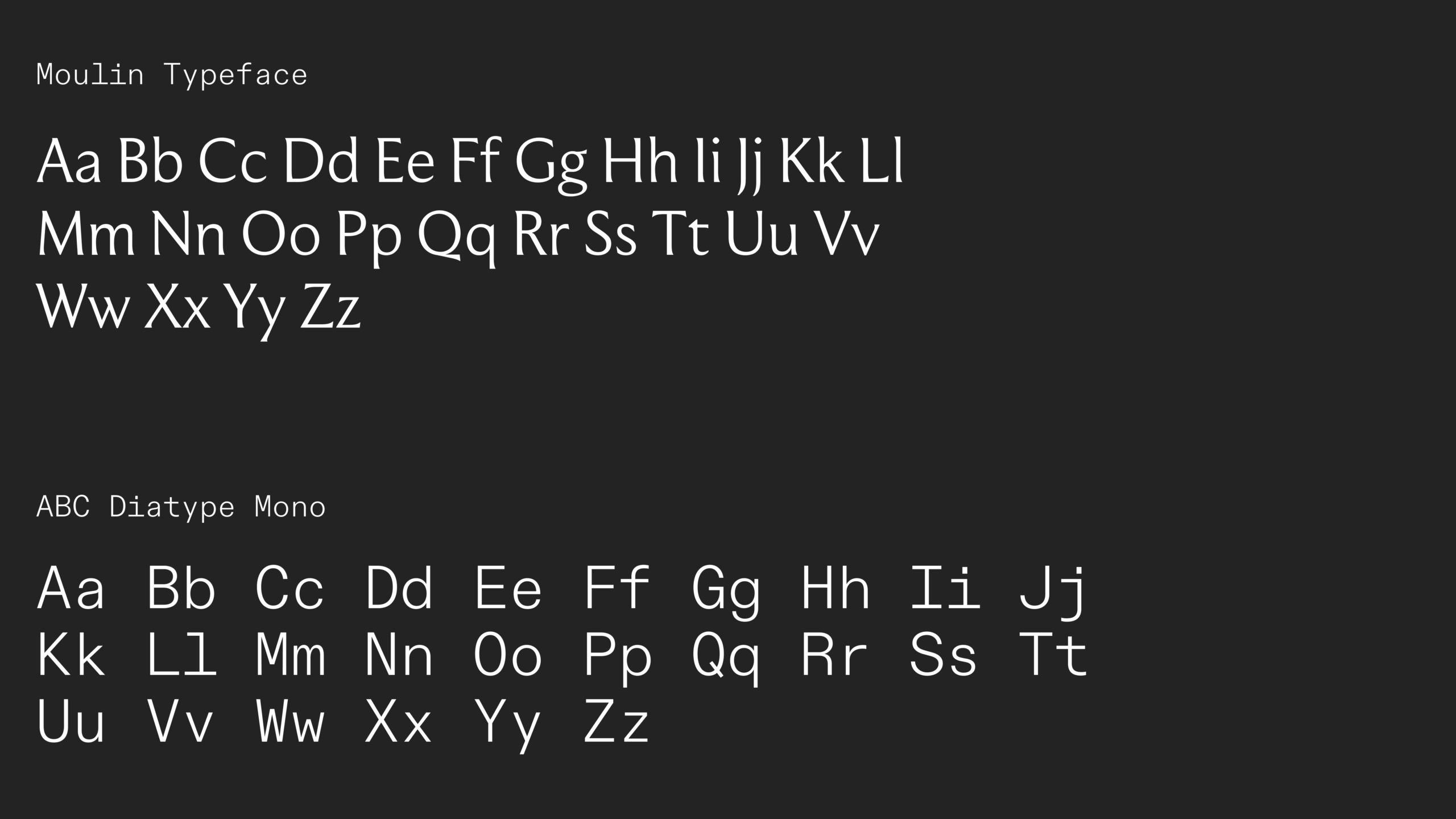 La typographie du logo et des titrages est la Moulin Light. Elle représente l’élégance, la singularité et le dynamisme.